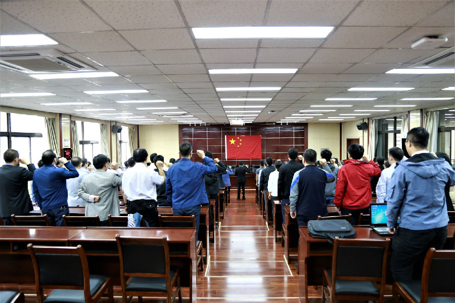 宣誓现场,中华人民共和国国旗居中布置,国旗醒目、庄重。卡提诺论坛 全体教师身着正装起立,举起右手握拳,面容肃穆,面向国旗。宣誓仪式由学院党委书记马行天领誓,全院教师齐诵誓言,做出庄严承诺。