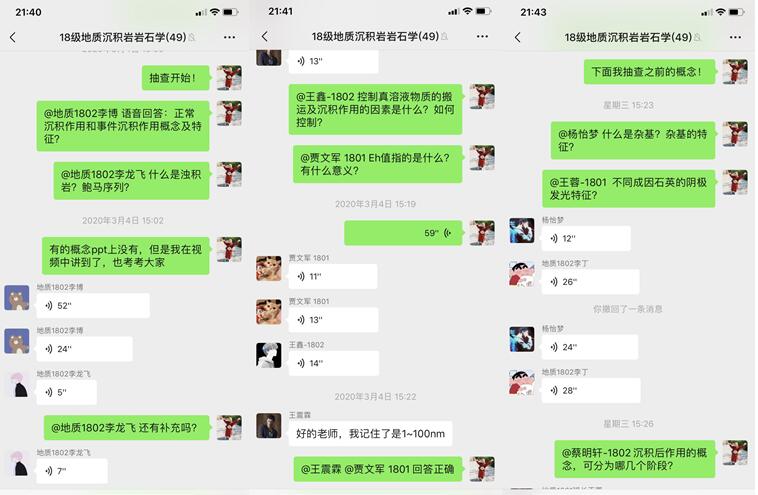《沉积岩岩石学》是地质学专业学生重要的专业基础课。正式开课前,陈老师积极备课,反复拿捏重点难点的讲授方式,提前将讲授内容通过录屏的方式上传至学习通,并在课前课后与班长和学习委员多次沟通,听取意见并进行改进,不断优化教学方法,提高教学效果。陈老师认为线上专业课的学习,应注重学生对概念的理解和吸收,而对于本科生而言,最直接有效的方式就是利用图片与视频,通过现象与实例反复列举,充分调动学生们的想象力,将难以理解的概念转为通俗易懂的图像。为此,陈老师将学生学习通视频学习和微信群群聊相结合,通过微信群互动交流的方式强化学生对重点、难点的掌握。第一节课以学生自主观看提前上传的录屏视频和课件为主,第二节课采用微信群点名和测验的方式,考察学生对知识点的掌握程度,知识点抽查不局限于本节课内容,对学过的课程内容也反复抽查,对出现的问题进行强化讲解,以确保不出现“猴子掰玉米现象”。