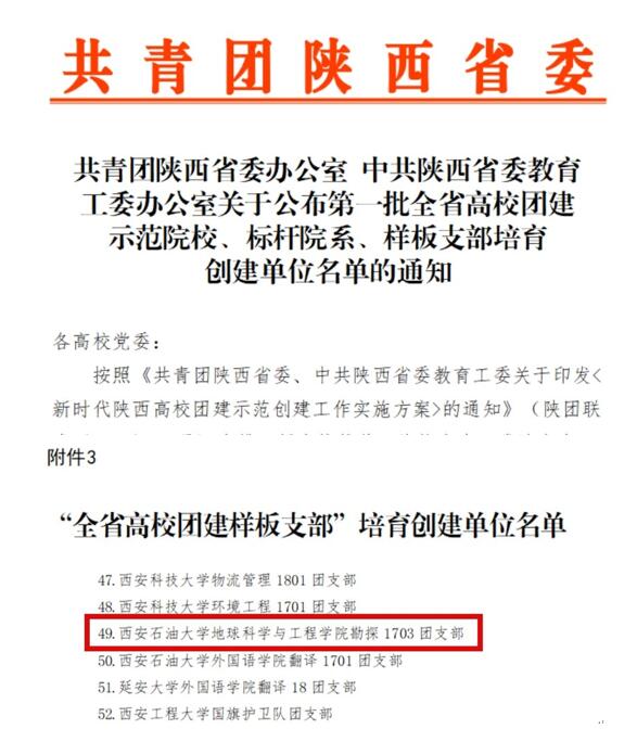 勘探1703团支部获批“陕西省高校团建样板团支部”培育创建单位。