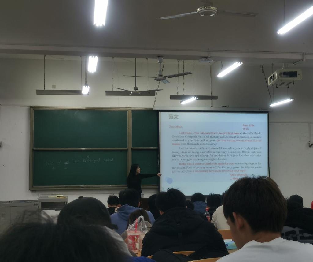 本次讲座主题为英语四级作文强化训练。讲座开始前,李老师和同学们讲述了自己学习英语的经历及备考英语专业八级写作模块的技巧,同时记录了同学们在写作模块遇到的问题和困扰。讲座中,李老师首先从阅卷人视角,为同学们讲解了写作得分要点,要求各位同学在考试中做到字体工整、卷面整洁,注意语言正确性与多样性。随后,李老师为同学们讲解了书信作文、图表作文、三段式作文写作方法及常用句式。李老师和同学们在现场共同背诵作文常用句式及模板,同学们用真题进行现场写作演练。最后,李老师鼓励同学们认真复习、努力备考,争取高分通过英语四六级。