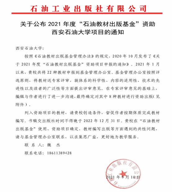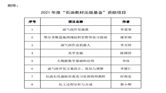 近日,石油工业出版社有限公司公布了2021年度“石油教材出版基金”资助项目,决定对卡提诺论坛 申报的8种教材进行资助出版。学院李爱荣副教授申报的《油气田开发地质》、庞军刚副教授申报的《鄂尔多斯盆地周缘沉积岩野外实习指南》2种教材获得本次出版资助。