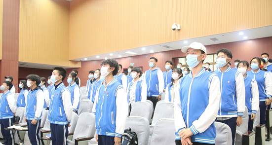 学生会主席靳兴同学带领全体学员面向班旗郑重宣誓,要坚定正确的政治方向,全心全意为同学服务。