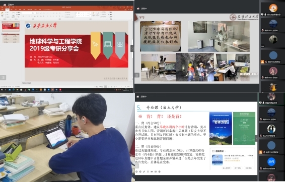 举办了线上考研经验交流会。邀请了6位毕业于地科院现就读于中国地质科学院、中南大学、长安大学、西南石油大学、中国石油大学(北京)和昆明理工大学的2017级和2018级优秀学长进行了交流分享。学院全体学工干部及2019级学生参加了此次交流会。