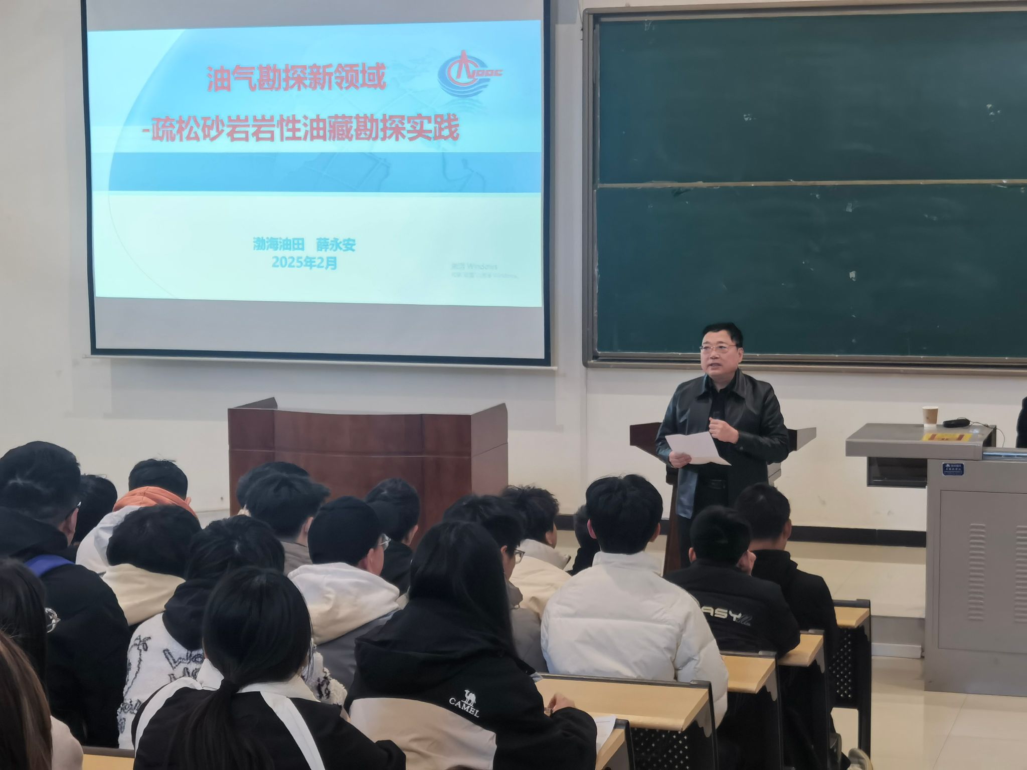 邀请中海油渤海油田原副总经理兼总地质师、首席科学家 薛永安教授为学院师生带来一场题为“油气勘探新领域-疏松砂岩岩性油藏勘探与系列大发现”的学术讲座。讲座由学院党委书记马行天主持,学院各年级辅导员及200余名本科生参加。