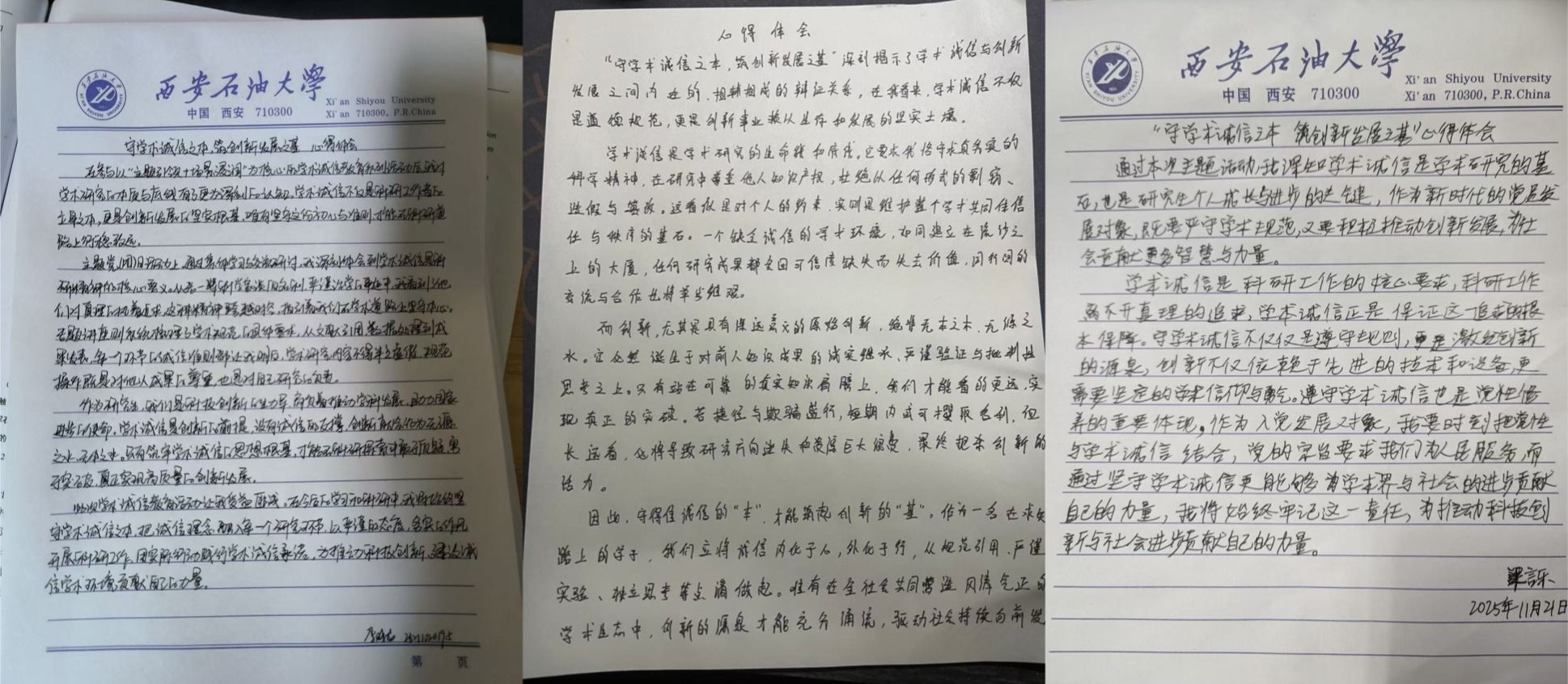 作为活动的重要组成部分,新发展党员结合本次主题党日活动的学习内容和自身思想实际,认真撰写了心得体会。他们纷纷表示,通过党史学习,更加坚定了理想信念,明确了作为一名党员在学术领域应有的担当;通过聆听优秀党员代表的经验分享,对如何将党员标准融入日常学习科研有了更清晰的认识。他们承诺,将从入党之初就扣好“学术诚信”的第一粒扣子,以党员的标准严格要求自己,自觉抵制学术不端行为,努力钻研专业知识,勇于挑战前沿科学问题,争做诚实守信、敢于创新的表率,以实际行动践行入党誓词,为服务国家创新发展战略贡献青春力量。