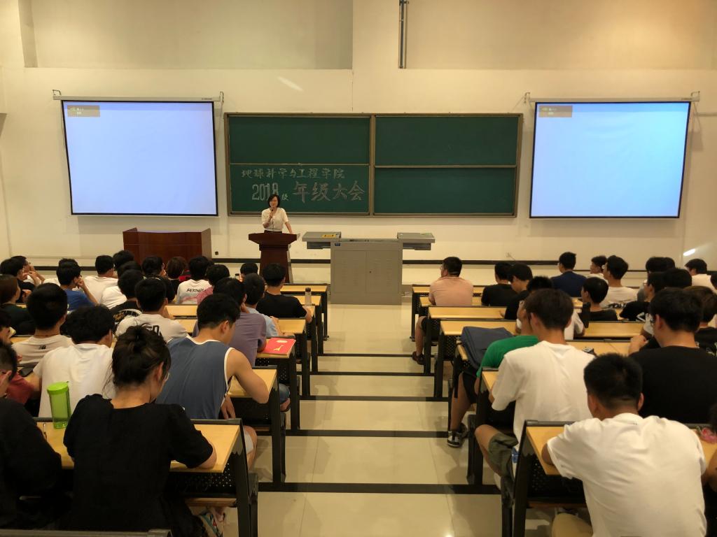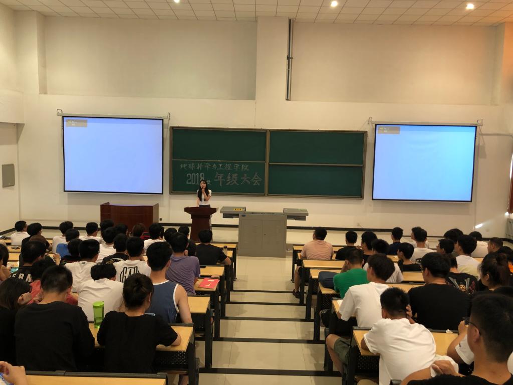 在石工地科楼115教室举行2018级主题年级大会。学院党委副书记王莹、学工办主任李化杰参加年级大会。会议由辅导员李佩琦老师主持,2018级全体同学参加大会。